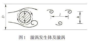 渦街流量計(jì)屬于速度式流量計(jì),是由漩渦發(fā)生體和頻率檢測(cè)器構(gòu)成的變送器、信號(hào)轉(zhuǎn)換器等環(huán)節(jié)組成。其測(cè)量原理是在流動(dòng)的流體中,若垂直流動(dòng)方向放置一個(gè)漩渦發(fā)生體,在某一雷諾數(shù)范圍內(nèi),將在漩渦發(fā)生體的后面的兩側(cè)交替產(chǎn)生有規(guī)律的漩渦(見(jiàn)圖1),旋渦列在旋渦發(fā)生體下游非對(duì)稱地排列。