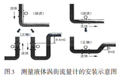 測(cè)量液體時(shí)為保證測(cè)量精確,渦街流量計(jì)的管道必須充滿液體。渦街流量計(jì)安裝在水平管道上時(shí),應(yīng)將下游段的管道高于渦街流量計(jì),以保持滿管;當(dāng)流體向下流動(dòng)時(shí),應(yīng)將下游段的管道高于渦街流量計(jì),以保持滿管。流量計(jì)安裝在垂直管道上時(shí),流體應(yīng)該向上流動(dòng),當(dāng)流體向下流動(dòng)時(shí),應(yīng)將下游段的管道高于渦街流量計(jì),以保持滿管,如圖3所示。