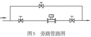 為了方便地檢查和清洗流量計(jì)(漩渦發(fā)生體),安裝如圖5所示的旁通管道。對(duì)于初次投運(yùn)或管線設(shè)備檢修后,開(kāi)車時(shí)應(yīng)先使工藝介質(zhì)走旁路24小時(shí),待介質(zhì)干凈時(shí)開(kāi)表,以防變送器被異物阻塞或變送探測(cè)器被損壞。