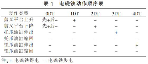 改進(jìn)后液壓系統(tǒng)工作原理:通過(guò)溢流閥調(diào)整剪叉油缸工況所需壓力,通過(guò)疊加溢流閥來(lái)調(diào)整托爪和鎖爪工況所需壓力。 剪叉平臺(tái)上升(剪叉油缸縮回)或下降(剪叉油缸伸出)時(shí) 0DT 先得電,當(dāng)剪叉油缸到位后 0DT 失電,大泵供油無(wú)壓流回油箱。 通過(guò)電磁換向閥 17(1DT 和 2DT 的得失電)來(lái)控制剪叉油缸的伸出或縮回,通過(guò)電磁換向閥 18(3DT 和4DT 的得失電)來(lái)控制托爪和鎖爪的伸出和縮回。改進(jìn)后液壓系統(tǒng)的電磁鐵動(dòng)作順序如表 1 所示。