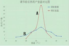 圖3中的曲線 A和B供熱管網(wǎng)氣體流量計(jì)調(diào)節(jié)前后的熱用戶室溫變化情況,橫坐標(biāo)表示室溫分布,縱坐標(biāo)表示熱用戶數(shù)量。從圖中可以看出,氣體流量計(jì)調(diào)節(jié)前熱用戶室溫比較分散,既有室溫小于18℃的熱用戶,也有室溫大于24℃的熱用戶。熱用戶室溫“近熱遠(yuǎn)冷”,供熱管網(wǎng)存在水力不平衡現(xiàn)象。氣體流量計(jì)調(diào)節(jié)后,有49戶用戶室溫在20℃~21℃之間,從圖中可以看出室溫分布范圍縮小,平均室溫降低,從而,不僅減少了供熱量,也大大提高了供熱品質(zhì)。一般來(lái)講,對(duì)采暖系統(tǒng),每增加 1℃平均室溫,能耗增多 5%~10%。采暖系統(tǒng)實(shí)現(xiàn)平衡后,常常可以降低平均室溫1℃~3℃。