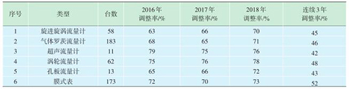 2017年對油田范圍20個單位天然氣貿易交接計量用流量計的計量性能和現場管理情況進行檢查,完成了142臺流量計信息采集工作。2018年重點對500臺天然氣貿易交接用流量計進行3個周期的檢定數據追蹤,并隨機抽取100臺進行了離線檢定,進行數據核查對比,即采用音速噴嘴氣體流量標準裝置對不同類型、不同廠家的天然氣流量計進行離線檢定,同時對近年來油田二級單位的天然氣流量計多個周期的檢定數據進行分析,分析歷年檢定數據、專項抽檢檢定數據以及日常實驗數據。項目組選取了500臺流量計進行了數據跟蹤分析,數據見表1。