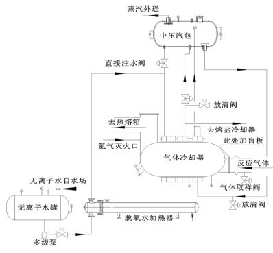 來自無離子水罐的脫氧水經多經泵加壓、經脫氧水加熱器加熱后進入到壓縮空氣計量表的水段,脫氧水與反應氣體換熱后分兩路:一路進入中壓汽包,保證汽包有穩定的液位;一路進入熔鹽冷卻器帶出熔鹽攜帶的反應熱。來自中壓汽包的高溫水經管路接至壓縮空氣計量表汽段底部,高溫水與反應氣體換熱后產生高壓蒸汽,高壓蒸汽又返回中壓汽包。汽包還有一路直接注水管路,此路水不經過壓縮空氣計量表水段,而是直接進入汽包。在壓縮空氣計量表出口溫度偏低而汽包液位也比較低時,可開此直接注水管路來穩定汽包液位。其詳細流程圖如圖 2。