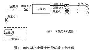 根據實際注汽參數結果分析,可初步得出蒸汽流量計的誤差:干度的誤差在15%以內,其中*大誤差13.2%,*小誤差9.0%;流量誤差則在30%以內,誤差為-1.6%~25.5%;蒸汽兩相流計量總誤差5.8%~19.4%;蒸汽兩相流干度分配誤差9.0%~13.2%。蒸汽兩相流量計評價試驗的工藝流程如圖1所示。