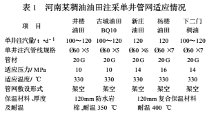 主要對河南油田某稠油注汽流程和單井注汽管網現狀進行調查,進而做出適應性分析與評價。井樓零區、一二區、三區、七區(除七區南部),古城B125、BQ10區,新莊與楊樓油田都采用計量站單井配汽流程;井樓油田七區南部、GQ3區,古城油田B125區及楊樓油田BQ26區注汽采用串糖糊蘆流程。河南稠油油田單井注汽管網適應情況見表1。