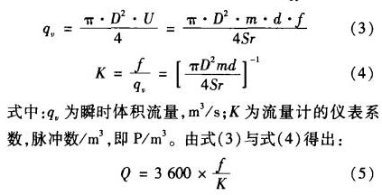 式中:m為漩渦發生體兩側弓形面積與管道橫截面面積之比;D為表體通徑,~;d為漩渦發生體迎面寬度,~;f為漩渦的發生頻率,Hz;U:為漩渦發生體兩側平均流速,耐s;sr為斯特勞哈爾數;U為被測介質來流的平均速度,耐s。管道內體積流量q。為: