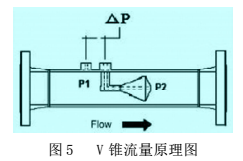 (1)V錐流量計:V錐流量計(V-cone flowmeter)是美國富沃得公司在20世紀80年代開始研發的一種差壓流量計,它的開發成功是差壓式流量測量質的飛躍。它利用V錐體在流場中產生的節流效應,通過檢測上下游壓差來測量流量。與普通節流件相比,它改變了節流布局,從中心孔節流改為環狀節流,工作原理如圖5。