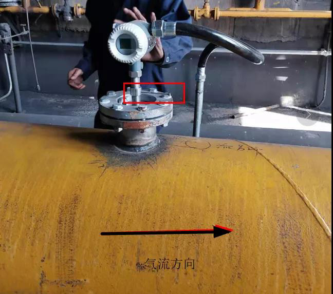 將表插入管道,表上面也有法蘭,有定位方向(表頭下面那個鐵棒是定位方向為出氣方向,)