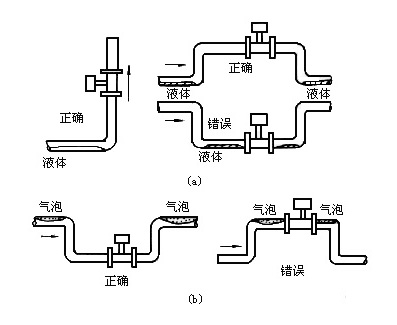VSF可安裝在室內或室外。如果安裝在地井里,有水淹的可能,要選用涎水型傳感器。傳感器在管道上可以水平、垂直或傾斜安裝,但測量液體和氣體時為防止氣泡和液滴的干擾,安裝位置要注意,如圖16所示。