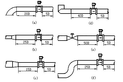 (3) 對于有變徑要求的工藝管線 , 前后直管段的長度分別保證不小于 10 D 和 5 D 就可以了 ; 如果必須在流量計的上游側(cè)選用閘閥 , 那么前直管段的長度不應小于 40 D。