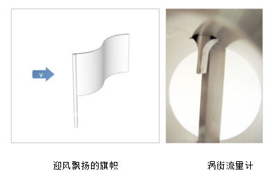 自然界的很多現象都源于渦街原理,比如迎風飄揚的旗幟,旗桿作為漩渦發生體, 當風從旗桿一側吹來時,旗桿阻擋了風,分別從旗桿兩側吹過的氣流在其后形成了漩渦,因此,旗幟能夠隨風飄揚。在渦街流量計中,正是采用了“卡門渦街原理”,測量管中有一個漩渦發生體,漩渦的脫落頻率正比于流量,漩渦脫落頻率通過傳感器中的壓電晶體來測量,公式如下: