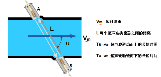 相比前兩種測量原理,超聲波時差法的原理則更加簡單易懂一些。與人們劃船或者游泳類似,超聲波在流動的流體中的傳播速度與流體的流速有關。順流而下的超聲波的傳播速度大于逆流而上的傳播速度。只要分別測量出超聲波順流和逆流的傳播時間,就可以依據下面的公式得到該路徑上瞬時流速。這樣,介質流量則可以通過流速、管道截面積等求得。