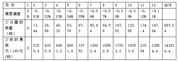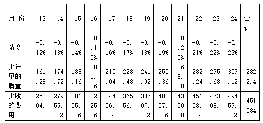 為了簡化計算,假設每個月孔板流量計因為磨損而產生的精度變化是線性的,每月精度下降0.01%,那么通過下表可以看出,*一年內損失的收益: