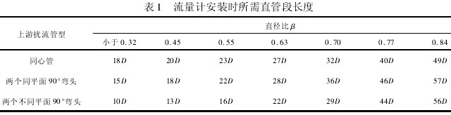 孔板流量計以簡單結實、成本低廉及無需額外標定等優勢在工業中獲得廣泛應用。但它也有自身的缺點: 受限于工作原理,量程比限制在3∶ 1~5∶ 1; 在水錘作用下,孔板會變形,如果設計或安裝不當甚至會堵塞管道; 孔板的直角邊緣在長期運行后會磨損,特別是在進行蒸汽介質測量時會改變孔板特性,影響測量精度,因此必須對孔板進行周期檢查并予以更換; 孔板流量計一般需要較長的直管段以保證精度,表 1 給出了不同直徑比β和不同上游擾流布置情況下所建議的直管段長度。