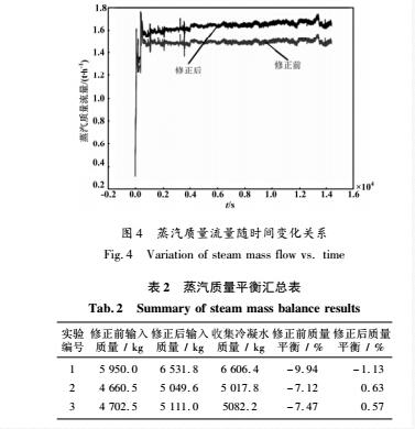 對圖4中蒸汽質量流量數值進行時間積分,可獲得對應條件下的蒸汽輸入總質量。實驗完成,冷卻后通過實驗殼下端收集稱重裝置稱量獲得輸出的冷凝水的總質量,通過對比兩者差異來評價修正前后質量流量計測量的精度。結果如表2所示,實驗編號1為圖4中所示質量結果統計,編號2和3為另外兩次測試結果。質量平衡結果表明,修正之后的質量流量計公式可以明顯提高測量精度。