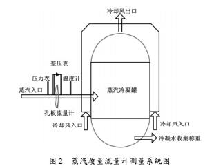蒸汽流量計使用的系統圖如圖2所示,圖2中蒸汽經過孔板質量流量計后進入罐體,罐體外表面有環形通風,可用于冷卻罐體。流量計前后布置有溫度、壓力補償測點,同時將流量計的實時測量結果進行采集匯總。蒸汽進入罐體后會提升關內壓力,同時會在罐內冷凝,冷凝的熱量通過罐外部冷卻帶走。進入罐內的蒸汽完全冷卻后可由下部出口將冷凝水排出稱重,將稱重結果與流量計實時測量結果進行對比,以驗證質量流量計變工況測量準確性。實驗過程中,隨著蒸汽進入罐體,罐內蒸汽難以及時完全冷凝,壓力會逐漸上升,這會導致上游流量計附近蒸汽狀態也會隨之變化,即流量計工作狀態與設計值相比在不斷變化,這種變化會隨著蒸汽流量的增大而逐漸增大。