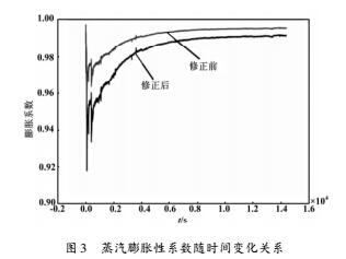通過實驗獲得蒸汽流動過程中測得的各項參數,并使用通用公式及修正后的公式進行相應計算處理,獲得所需數據。如圖3所示為修正前后膨脹性系數**間變化的關系。
