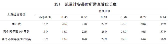 差壓式流量計(jì)中常用的有孔板流量計(jì)和新型V錐流量計(jì)兩種型式。孔板流量計(jì)以簡(jiǎn)單結(jié)實(shí)、成本低廉及無需額外標(biāo)定等優(yōu)勢(shì)在工業(yè)中獲得廣泛應(yīng)用。但它也有自身的缺點(diǎn):受限于工作原理,量程比限制在3:1~5:1;在水錘作用下,孔板會(huì)變形,如果設(shè)計(jì)或安裝不當(dāng)甚至?xí)氯艿溃豢装宓闹苯沁吘壴陂L(zhǎng)期運(yùn)行后會(huì)磨損,特別是在進(jìn)行蒸汽介質(zhì)測(cè)量時(shí)會(huì)改變孔板特性,影響測(cè)量精度,因此必須對(duì)孔板進(jìn)行周期檢查并予以更換;孔板流量計(jì)一般需要較長(zhǎng)的直管段以保證精度,表1給出了不同直徑比β和不同上游擾流布置情況下所建議的直管段長(zhǎng)度。