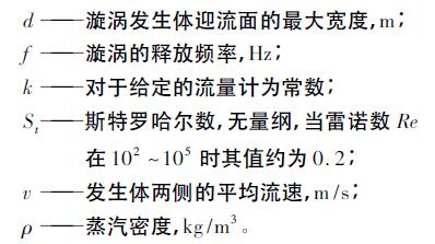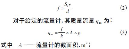 流體流經(jīng)設(shè)置在管道內(nèi)的漩渦發(fā)生體時(shí)會(huì)產(chǎn)生流動(dòng)振蕩,在發(fā)生體的兩側(cè)交替產(chǎn)生規(guī)則漩渦,測(cè)定其振蕩頻率可以反應(yīng)流量的大小。當(dāng)工況條件合適時(shí),漩渦頻率f和流體速度v成線性關(guān)系,且與密度無關(guān),可表示為: