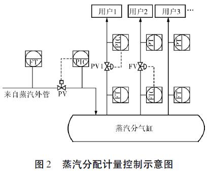渦街流量計(jì)經(jīng)常與調(diào)節(jié)閥安裝在同一根管道上以控制流量或壓力。如圖2所示,來自鍋爐的蒸汽總管經(jīng)壓力控制回路調(diào)節(jié)后進(jìn)入蒸汽分氣缸并根據(jù)用戶負(fù)荷測(cè)量總蒸汽用量,分氣缸分配到各用汽設(shè)備或裝置,同樣安裝有壓力或流量調(diào)節(jié)控制回路。