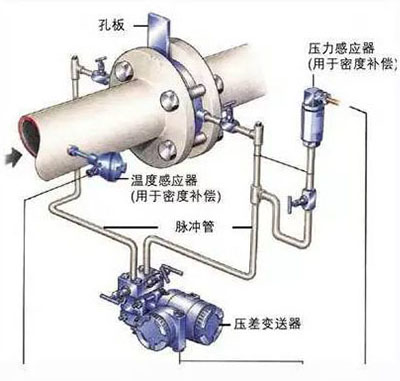 通過引壓管將差壓信號引入差壓變送器,差壓變送器將差壓信號送入流量積算儀,積算儀將差壓信號換算成流量信號。同時通過溫度和壓力傳感器測出蒸汽的溫度和壓力,積算儀根據(jù)當(dāng)時的溫度和壓力計算出補(bǔ)償后的流量。